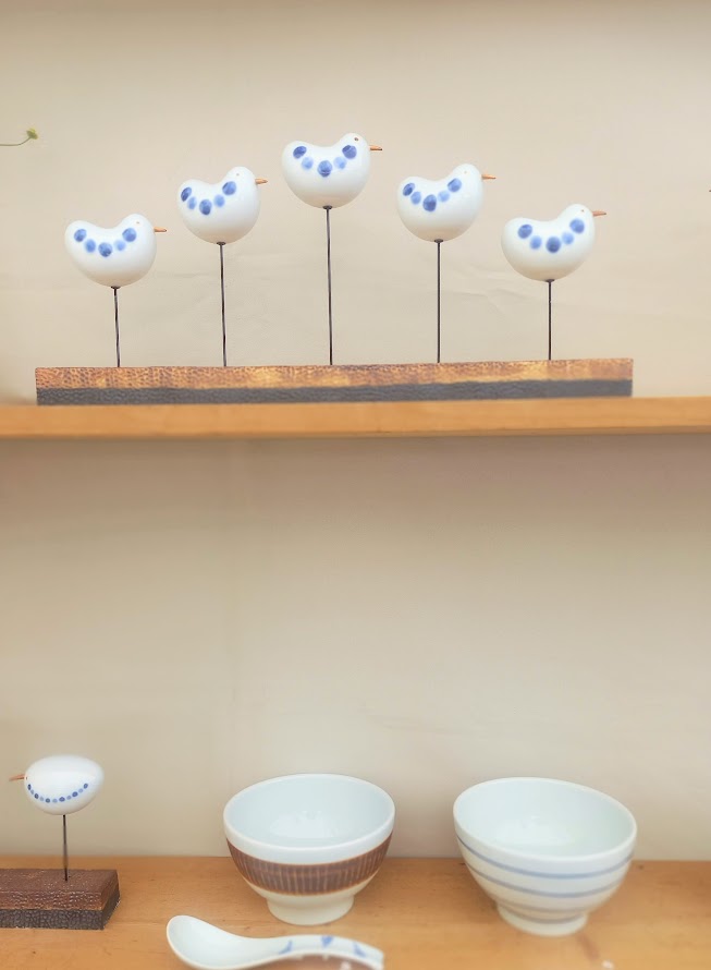 北欧風の優しい色彩や、鳥のモチーフの可愛らしいオブジェが並びます。